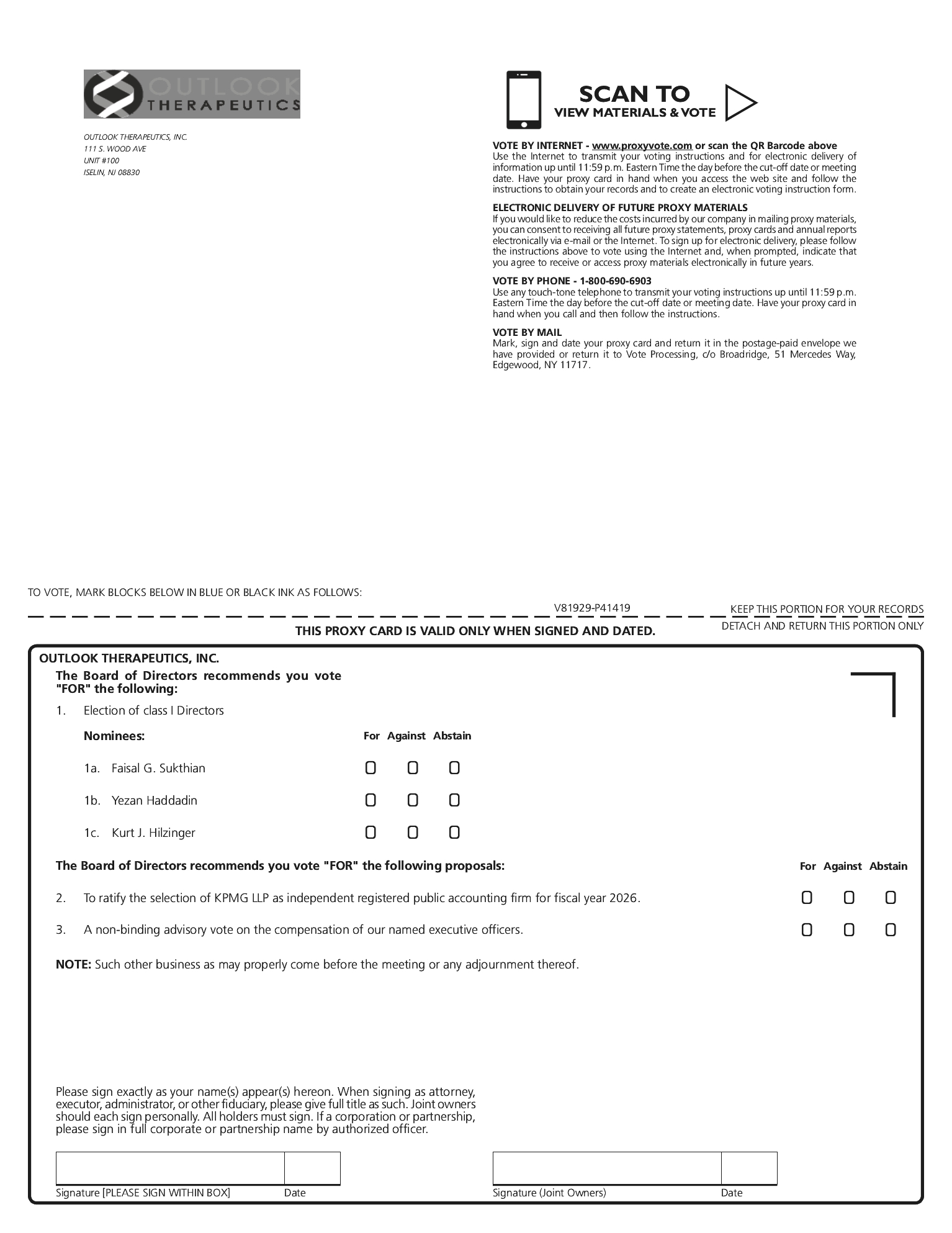 If on the Record Date your shares of common stock were registered directly in your name with Outlook Therapeutics’ transfer agent, Equiniti Trust Company, LLC, or Equiniti, then you are a stockholder of record. As a stockholder of record, you may vote in person at the meeting or vote by proxy. Whether or not you plan to attend the meeting, we urge you to vote by proxy over the telephone or on the internet as instructed in the Notice below to ensure your vote is counted.