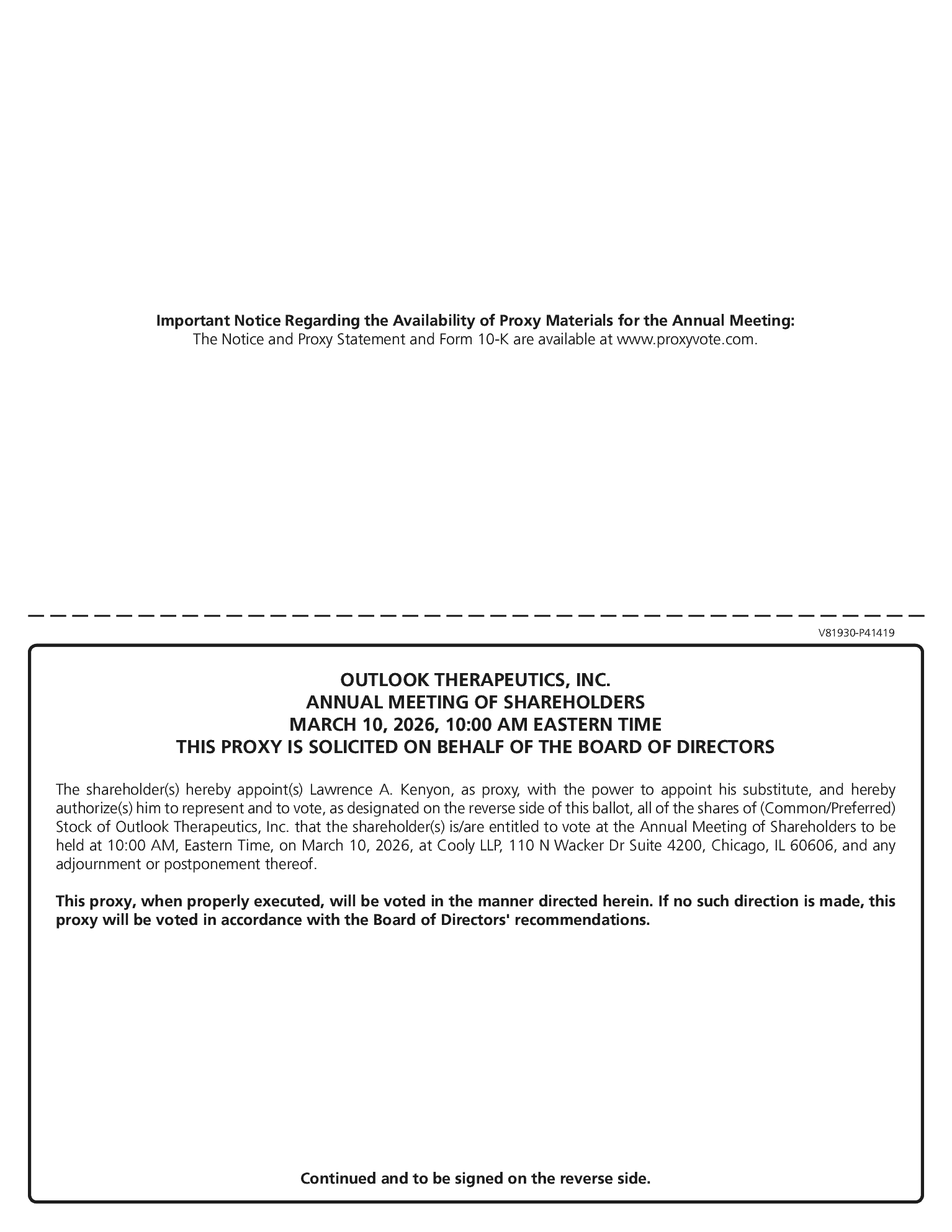Pursuant to the rules adopted by the Securities and Exchange Commission, or the SEC, we have elected to provide access to our proxy materials over the internet. Accordingly, we have sent you a Notice of Internet Availability of Proxy Materials, or the Notice, because the Board of Directors, or the Board, of Outlook Therapeutics, Inc., sometimes referred to as the Company or Outlook Therapeutics, is soliciting your proxy to vote at the 2026 Annual Meeting of Stockholders, or the Annual Meeting, including any adjournment or postponement thereof. This proxy statement summarizes the information you will need to know to cast an informed vote at the Annual Meeting. All stockholders will have the ability to access the proxy materials on the website referred to in the Notice or request to receive a printed set of the proxy materials. Instructions on how to access the proxy materials over the phone or through the internet or to request a printed copy may be found in the Notice.